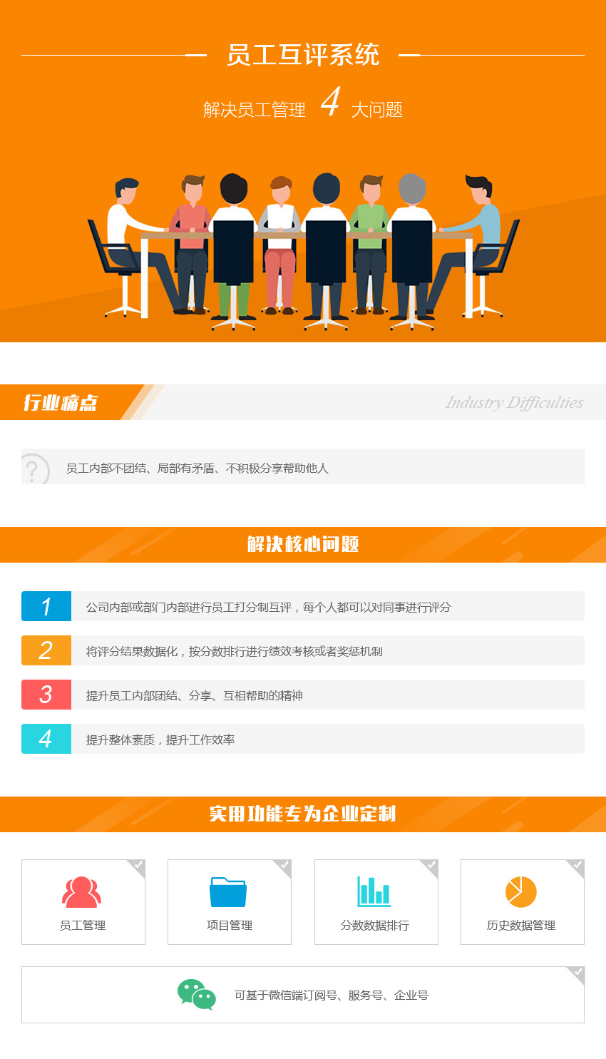 员工管理、项目管理、分数数据排行、历史数据管理、可基于微信端订阅号、服务号、企业号